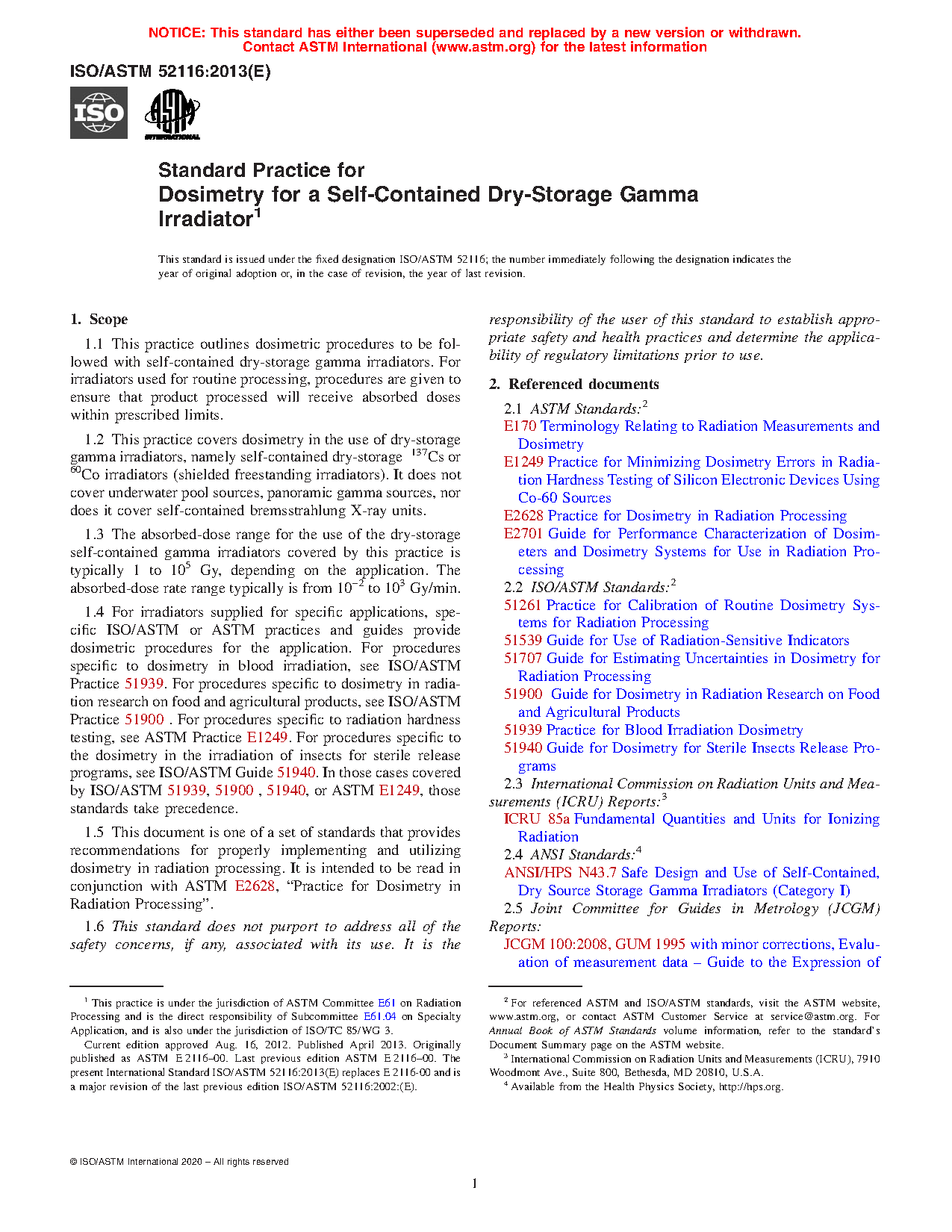 1.4 For irradiators supplied for specific applications, specific ISO/ASTM or ASTM practices and guides provide dosimetric procedures for the application. For procedures specific to dosimetry in blood irradiation, see ISO/ASTM Practice 51939. For procedures specific to dosimetry in radiation research on food and agricultural products, see ISO/ASTM Practice 51900 . For procedures specific to radiation hardness testing, see ASTM Practice E1249. For procedures specific to the dosimetry in the irradiation of insects for sterile release programs, see ISO/ASTM Guide 51940. In those cases covered by ISO/ASTM 51939, 51900 , 51940, or ASTM E1249, those standards take precedence.