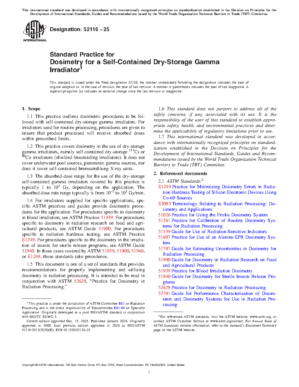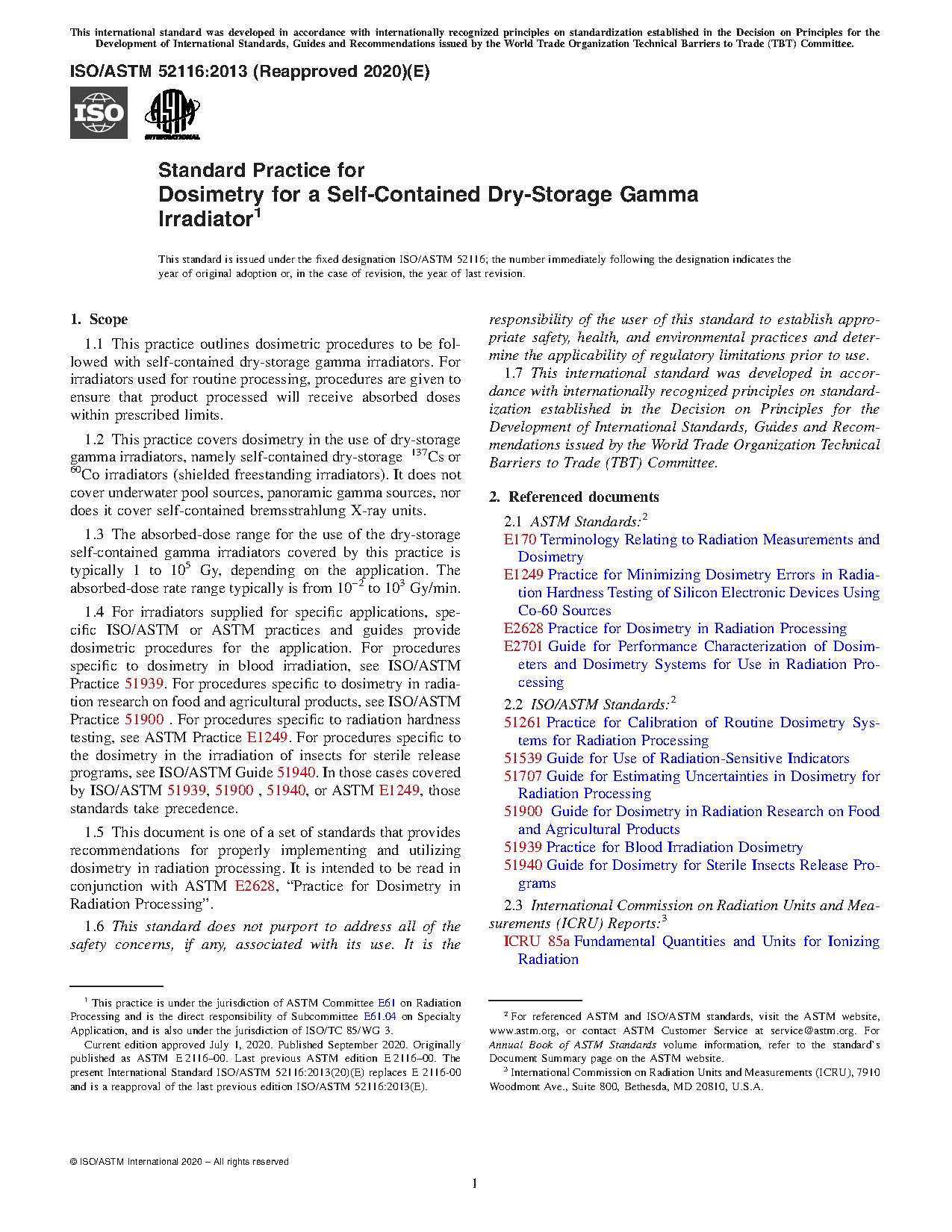 1.2 This practice covers dosimetry in the use of dry-storage gamma irradiators, namely self-contained dry-storage 137Cs or 60Co irradiators (shielded freestanding irradiators). It does not cover underwater pool sources, panoramic gamma sources, nor does it cover self-contained bremsstrahlung X-ray units.