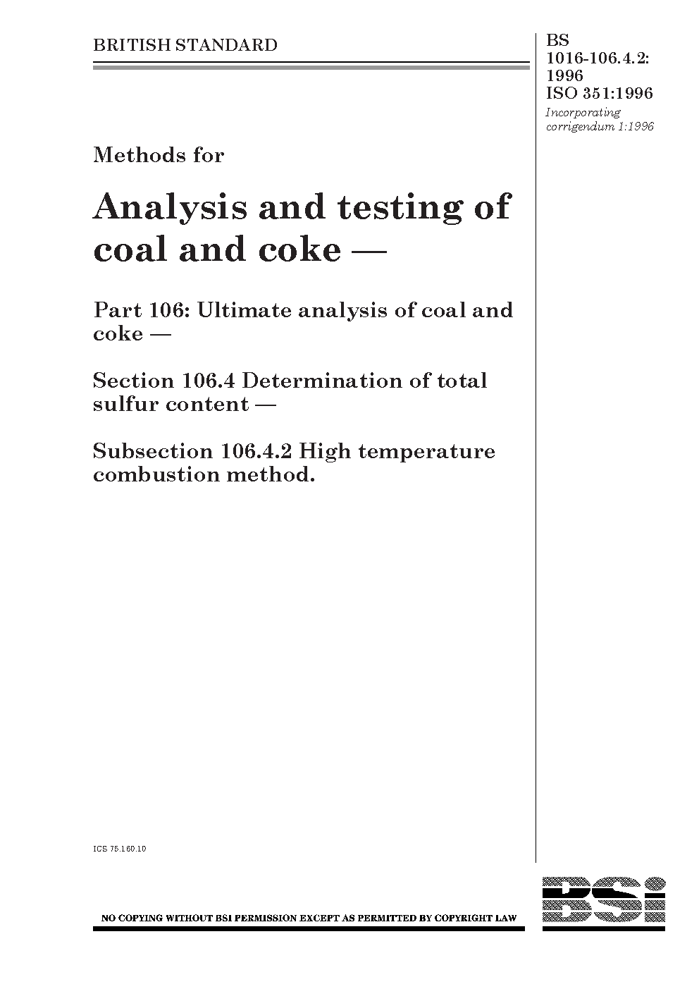 Methods for analysis and testing of coal coke. Ultimate Determination total sulfur content High temperature combustion method