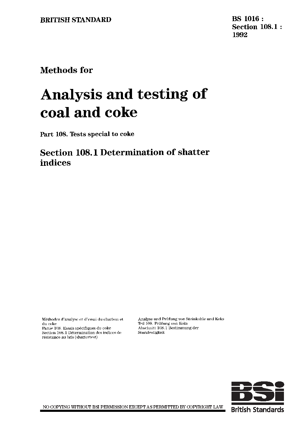 Methods for analysis and testing of coal coke. Tests special to coke Determination shatter indices