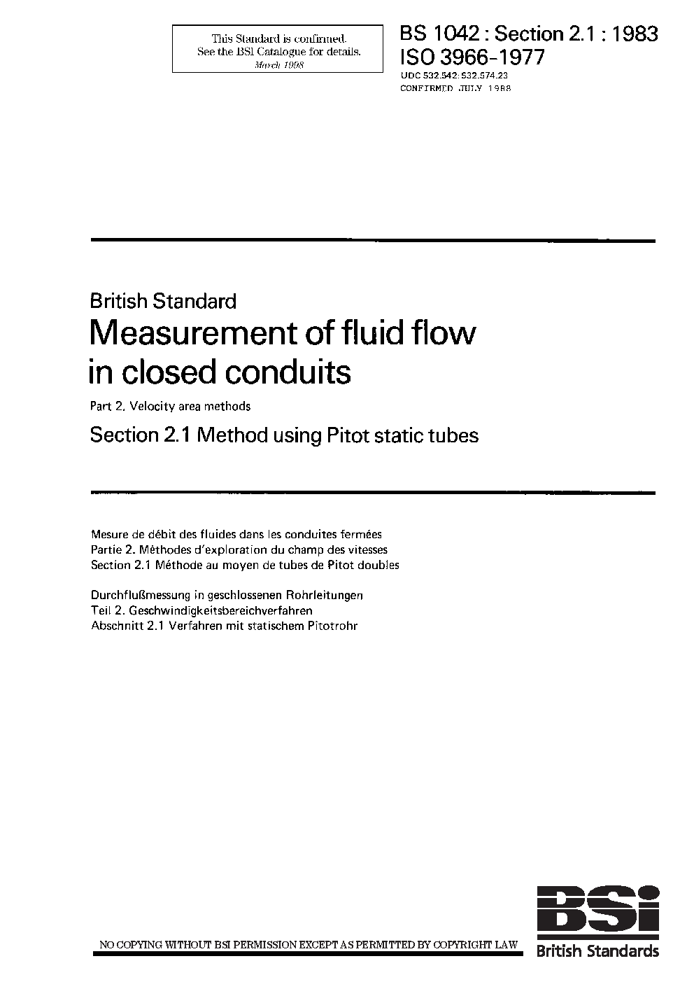 Measurement of fluid flow in closed conduits. Velocity area methods Method using Pitot static tubes