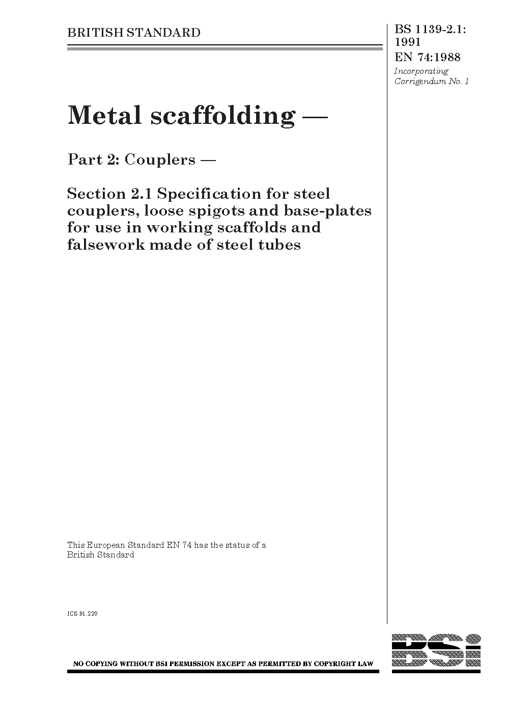 Metal scaffolding. Couplers Specification for steel couplers, loose spigots and base-plates use in working scaffolds falsework made of tubes
