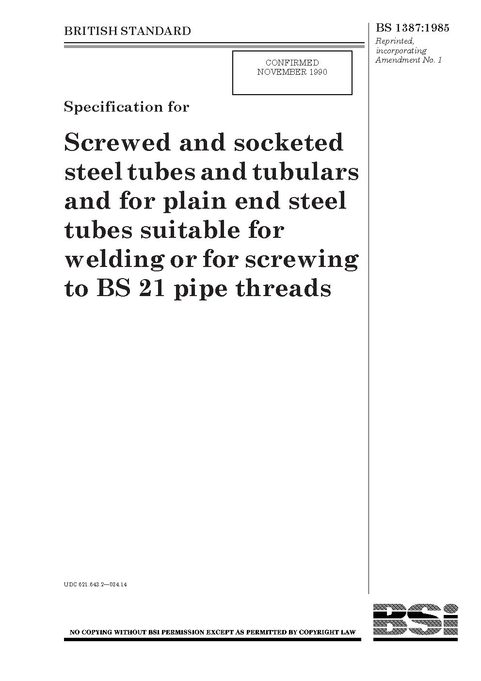 Specification for screwed and socketed steel tubes and tubulars and for plain end steel tubes suitable for welding or for screwing to BS 21 pipe threads