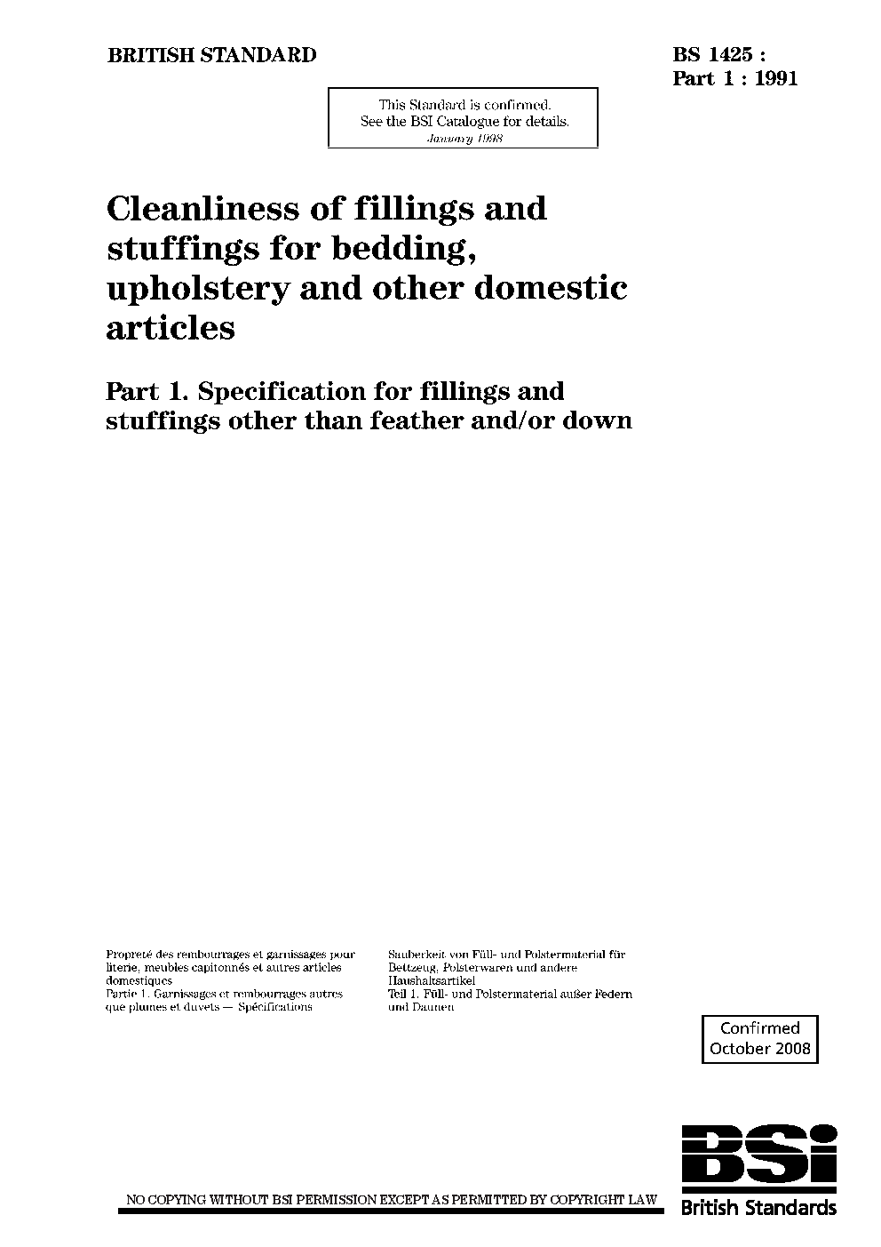 Cleanliness of fillings and stuffings for bedding, upholstery other domestic articles Specification than feather and/or down