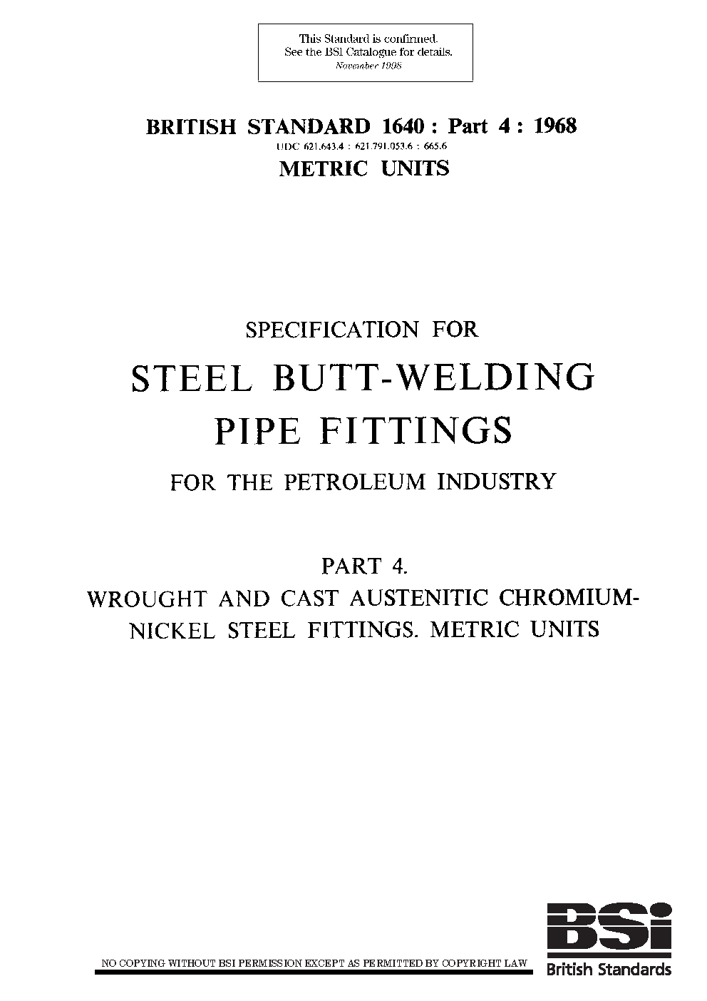 Specification for steel butt-welding pipe fittings the petroleum industry Wrought and cast austenitic chromium-nickel fittings. Metric units