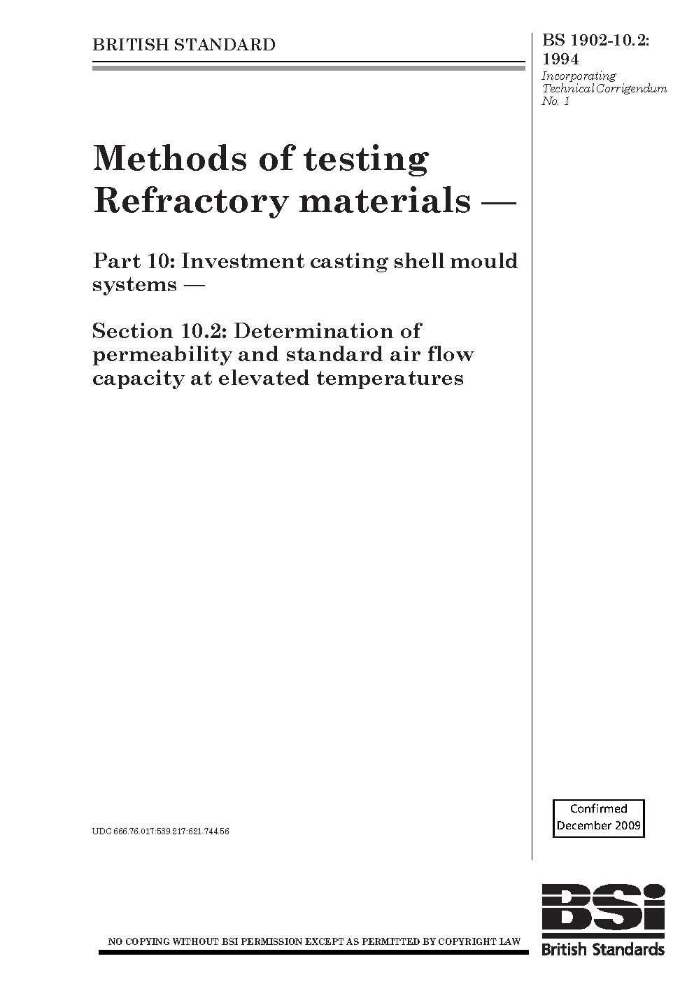 Methods of testing refractory materials. Investment casting shell mould systems Determination permeability and standard air flow capacity at elevated temperatures Section 10.2: