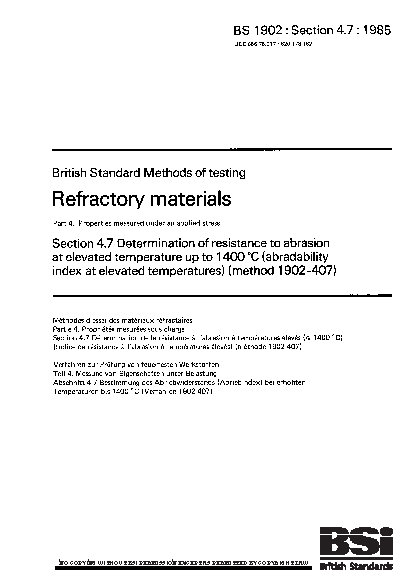 Methods of testing refractory materials. Properties measured under an applied stress Determination resistance to abrasion at elevated temperature up 1400°C (abradability index temperatures) (method 1902-407)
