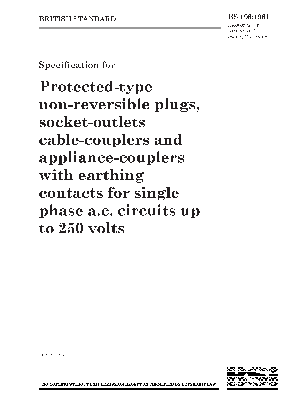 Specification for protected-type non-reversible plugs, socket-outlets cable-couplers and appliance-couplers with earthing contacts for single phase a.c. circuits up to 250 volts