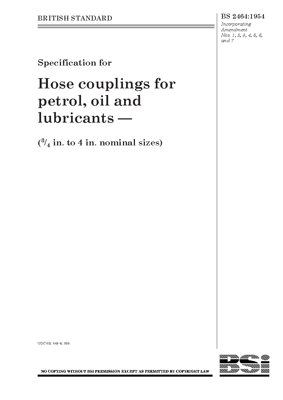 Specification for hose couplings for petrol, oil and lubricants (¾ in. to 4 in. nominal sizes)
