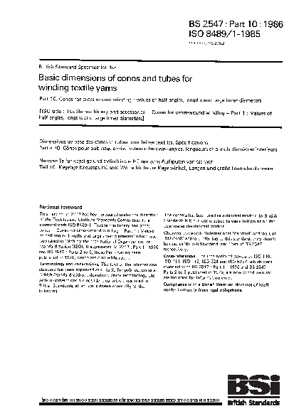 Specification for basic dimensions of cones and tubes winding textile yarns Cones cross-wound winding: values half angles, lengths large inner diameters