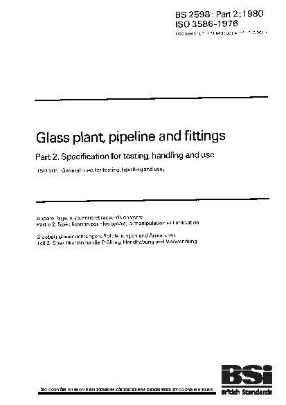 Glass plant, pipeline and fittings Specification for testing, handling use