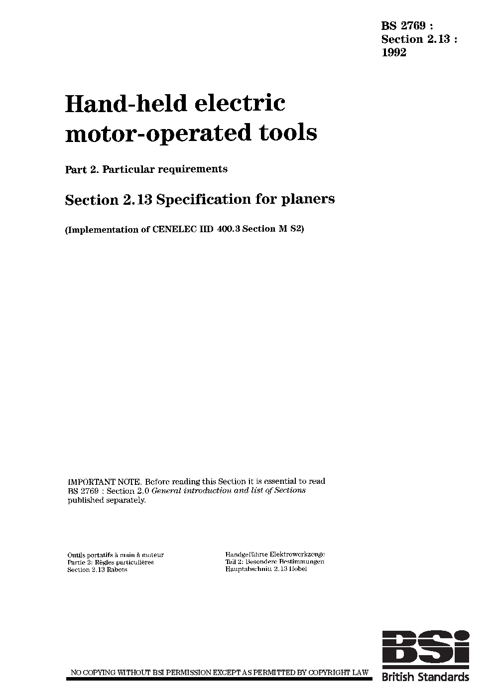 Hand-held electric motor-operated tools. Particular requirements Specification for planers