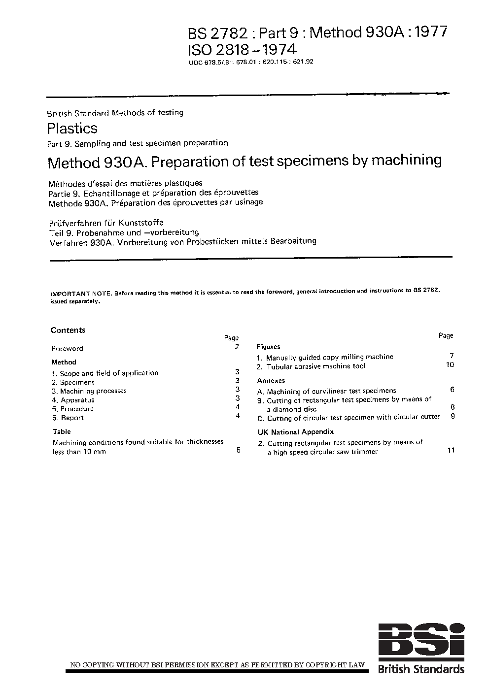 Methods of testing plastics. Sampling and test specimen preparation Preparation specimens by machining