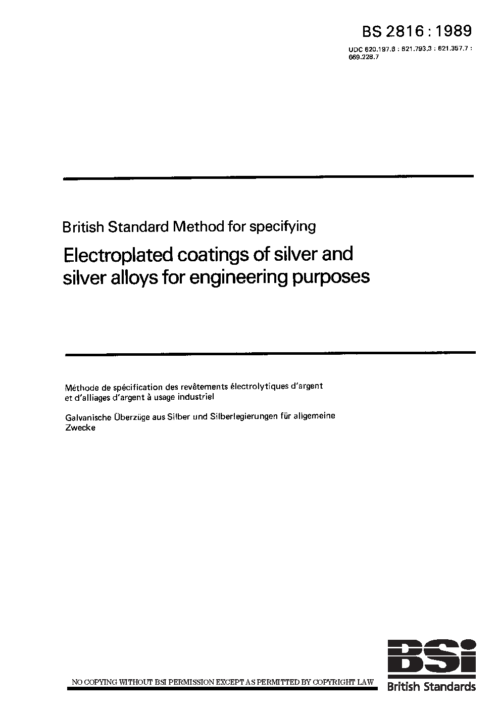 Specification for electroplated coatings of silver for engineering purposes
