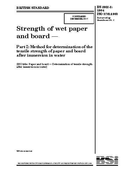 Strength of wet paper and board Method for determination the tensile strength after immersion in water