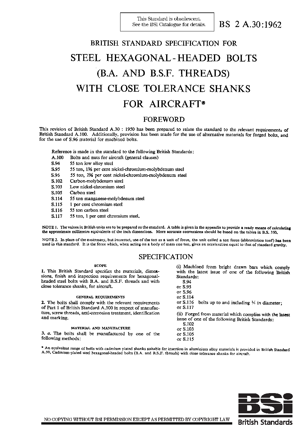 Specification for steel hexagonal-headed bolts (B.A. and B.S.F threads) with close tolerance shanks for aircraft