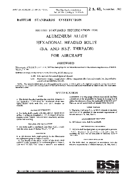Air transport engineering;Threaded components;British Association screw threads;Size;Aircraft components;BSF screw threads;Marking;Dimensions;Designations;Aluminium alloys;Bolts;Fasteners;Hexagonal-head fasteners;Anodizing;Threaded fasteners;External-thread fasteners