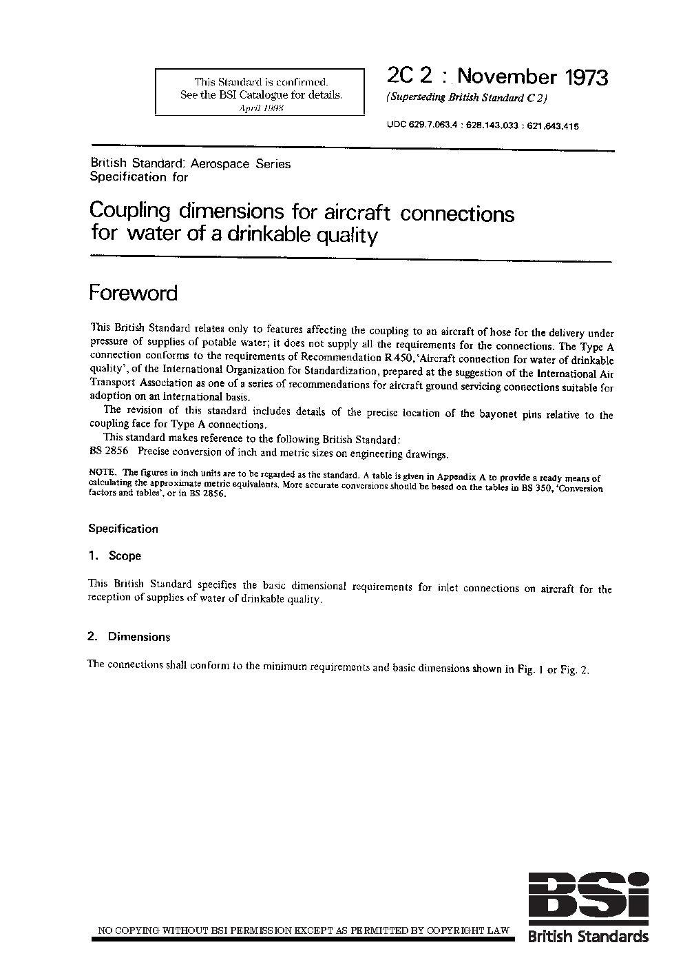 Specification for coupling dimensions for aircraft connections for water of a drinkable quality
