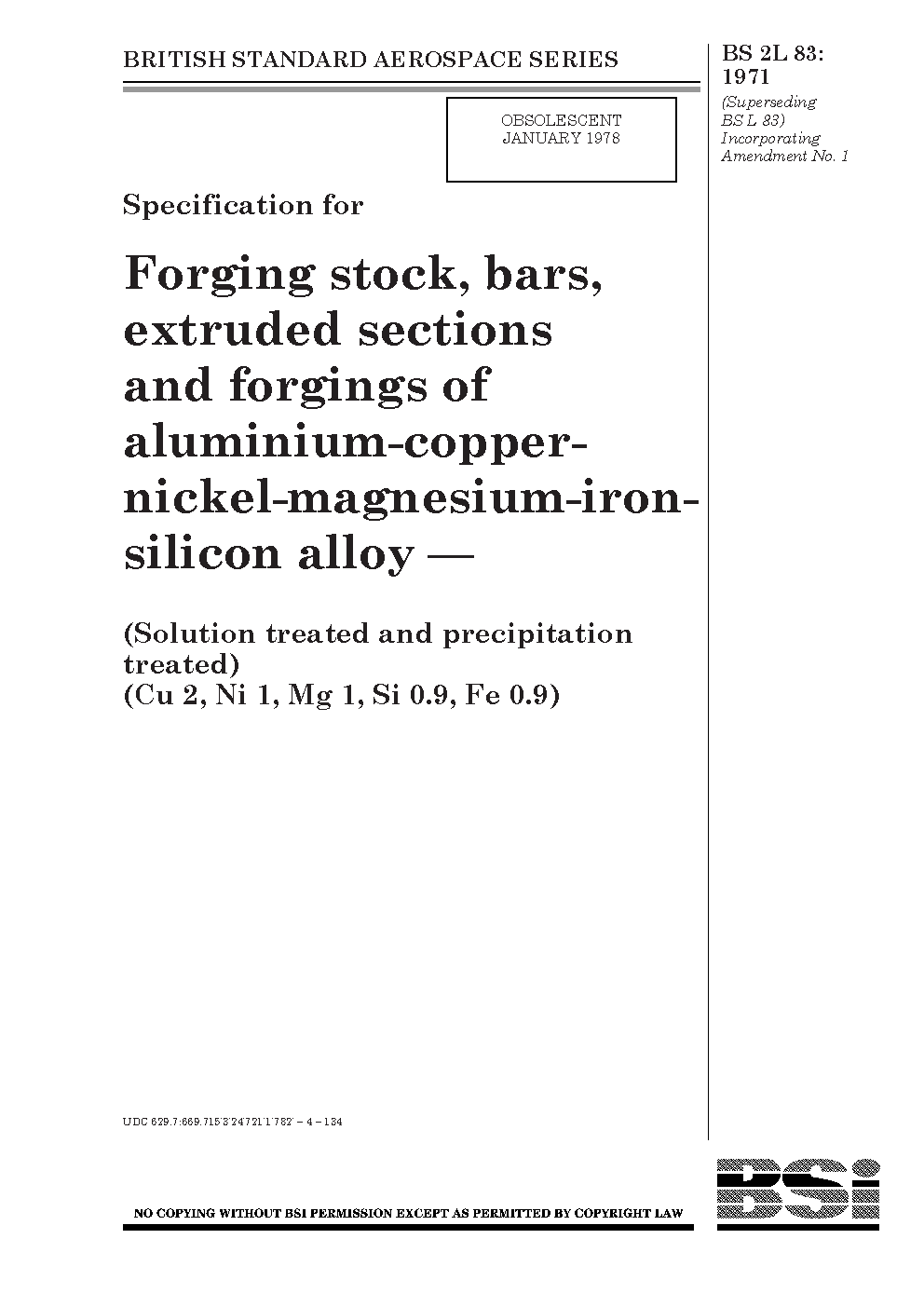 Specification for forging stock, bars, extruded sections and forgings of aluminium-copper-nickel-magnesium-iron-silicon alloy (solution treated and precipitation treated) (Cu 2, Ni 1, Mg 1, Si 0.9, Fe 0.9)