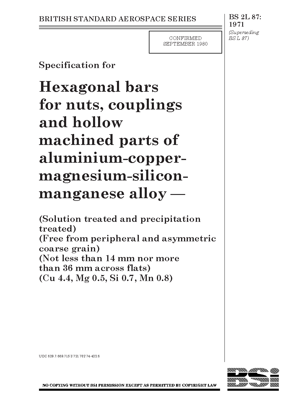 Specification for hexagonal bars for nuts, couplings and hollow machined parts of aluminium-copper-magnesium-silicon-manganese alloy (solution treated and precipitation treated) (free from peripheral and asymmetric coarse grain) (not less than 14 mm nor more than 36 mm across flats) (Cu 4.4, Mg 0.5, Si 0.7, Mn 0.8)