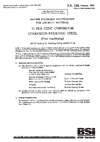Specification for aircraft material. 12 per cent chromium corrosion-resisting steel (free machining) (45/55 tonf/sq in: limiting ruling section 6 in)