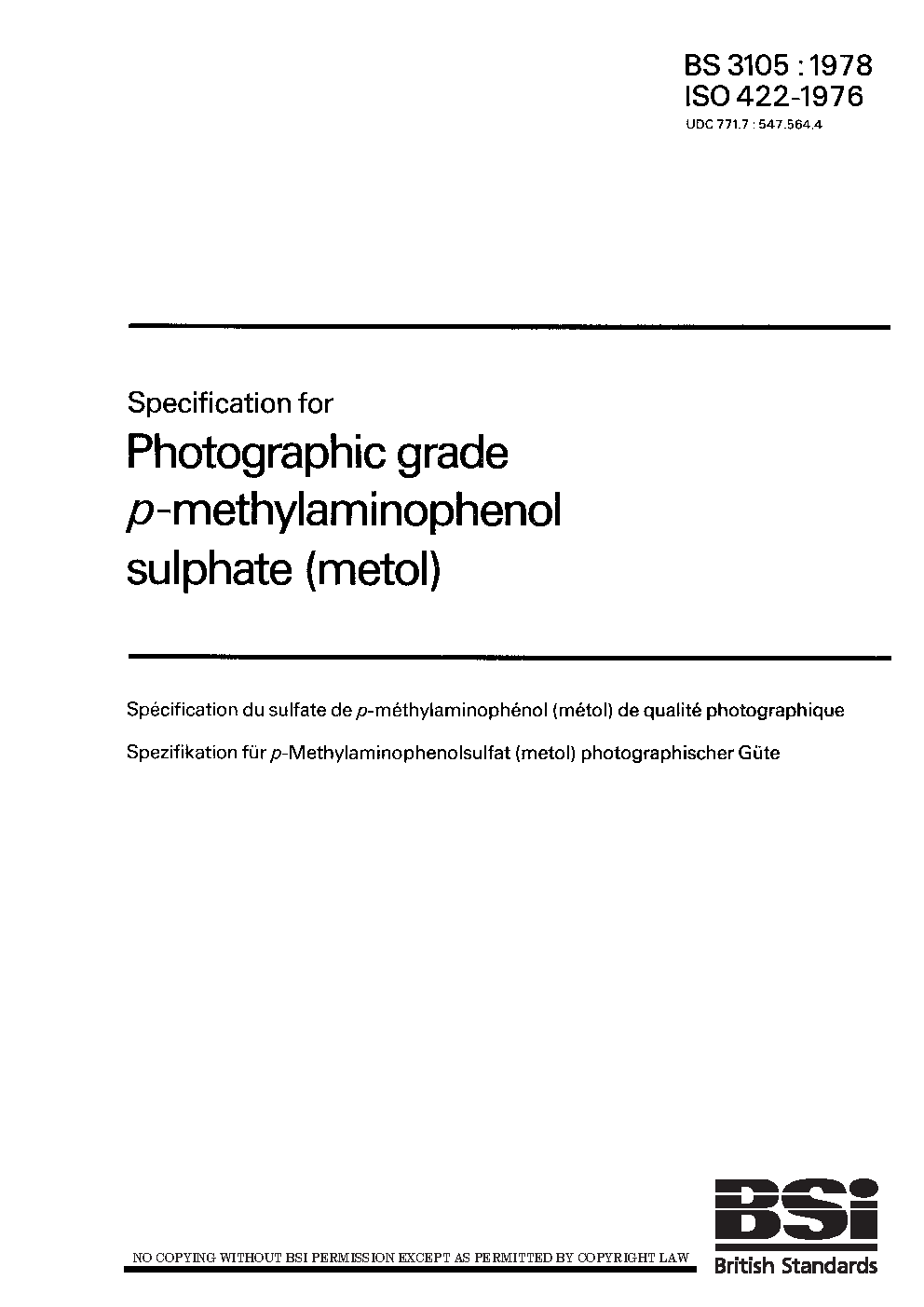 Specification for photographic grade p-methylaminophenol sulphate (metol)