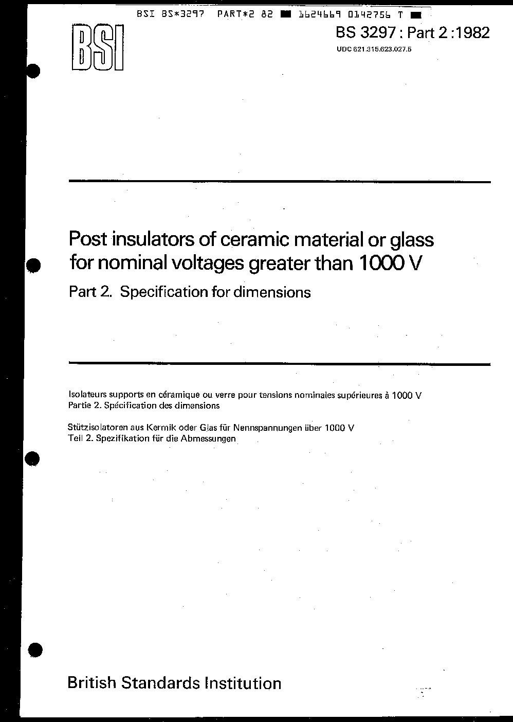 Post insulators;Grades (quality);Classification systems;Electric insulators;Designations;Impulse voltages;Frequencies;Glass;Leakage paths;Withstand voltage;Dimensions;Design;Fixing;Interchangeability;Diameter;Seatings;Ceramics;Breaking load;Holes;Rated voltage;Strength of materials;Height;Electrical insulation devices