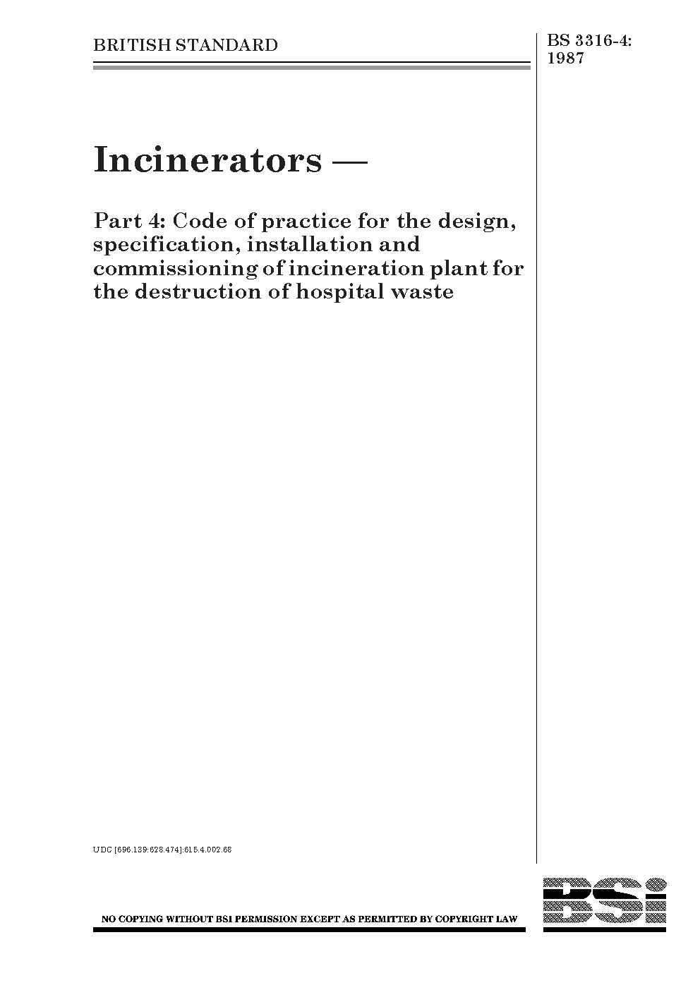 Incinerators Code of practice for the design, specification, installation and commissioning incineration plant destruction hospital waste