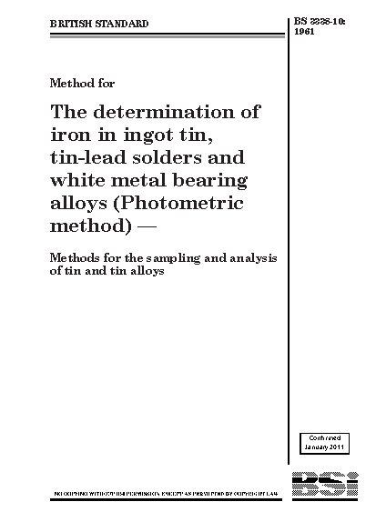 Spectrophotometry;Solders;Photometry (chemical analysis);Calibration;Bearing alloys;Ingots;Lead-containing alloys;Chemical analysis and testing;Determination of content;Tin;Tin alloys;White metal;Iron