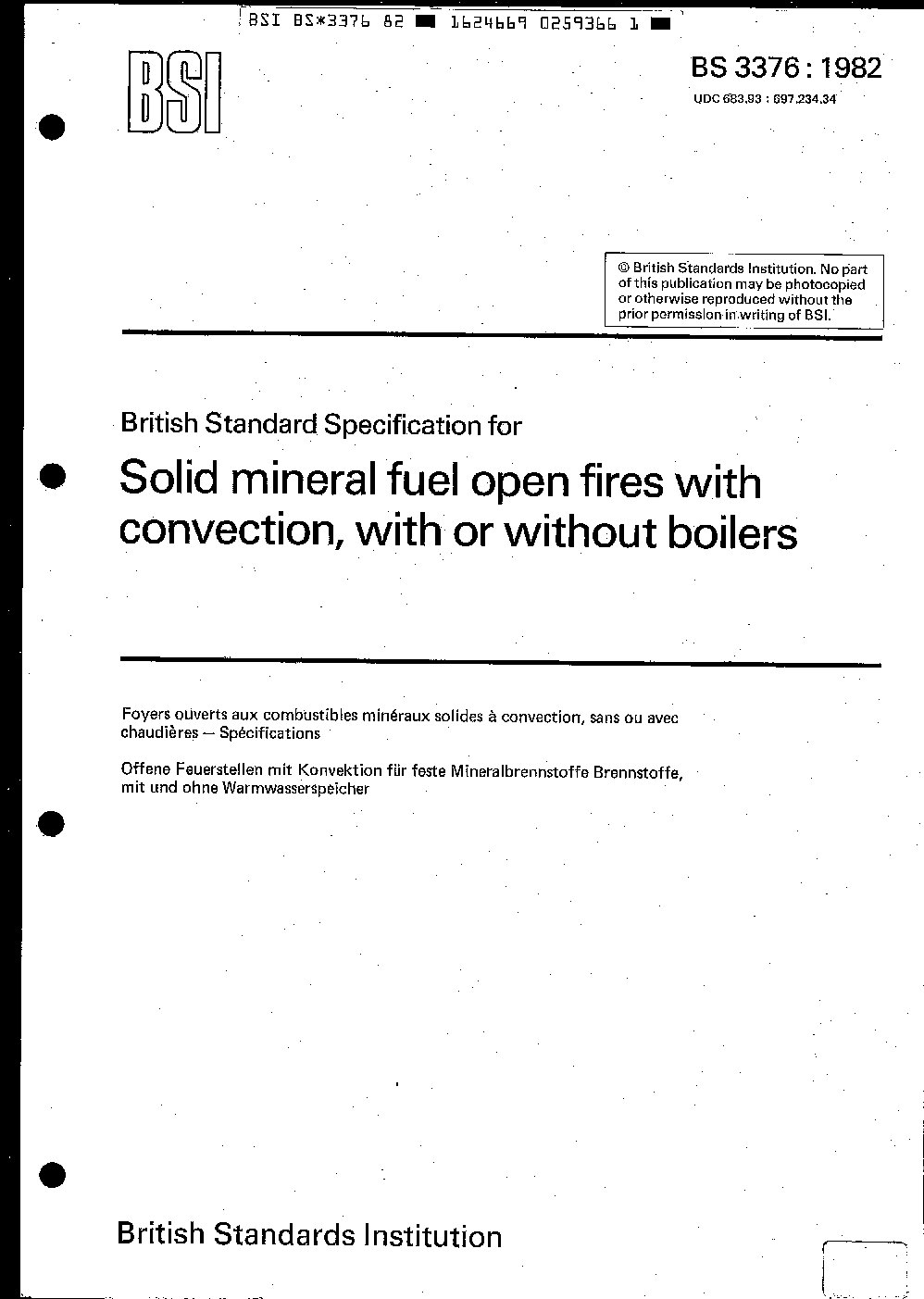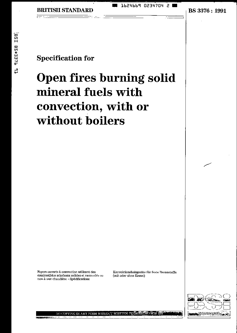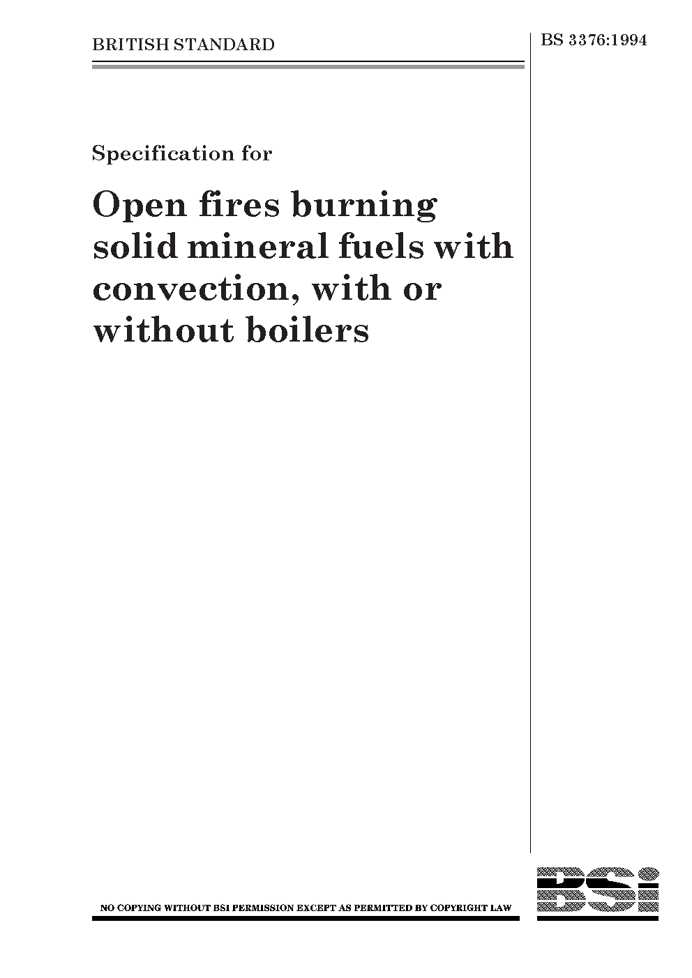 Specification for open fires burning solid mineral fuels with convection, with or without boilers