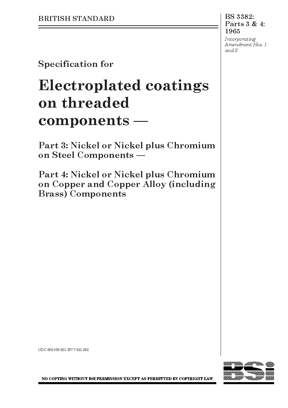 Specification for electroplated coatings on threaded components Nickel or nickel plus chromium steel components. copper and alloy (including brass)