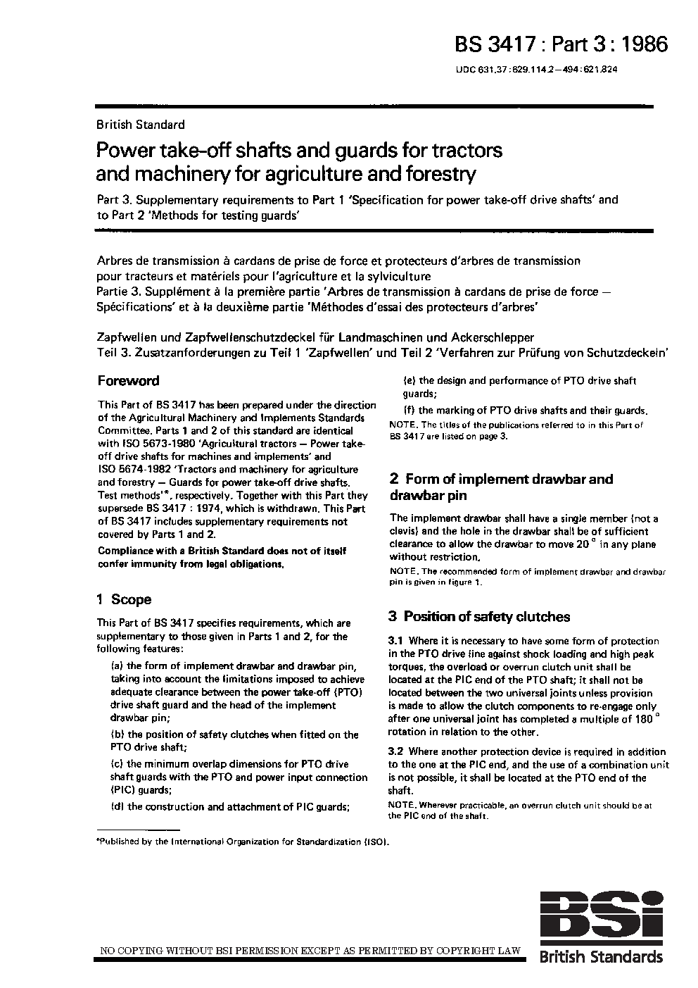Power take-off shafts and guards for tractors machinery agriculture forestry Supplementary requirements to Part 1. 'Specification power drive shafts' 2. 'Methods testing guards'