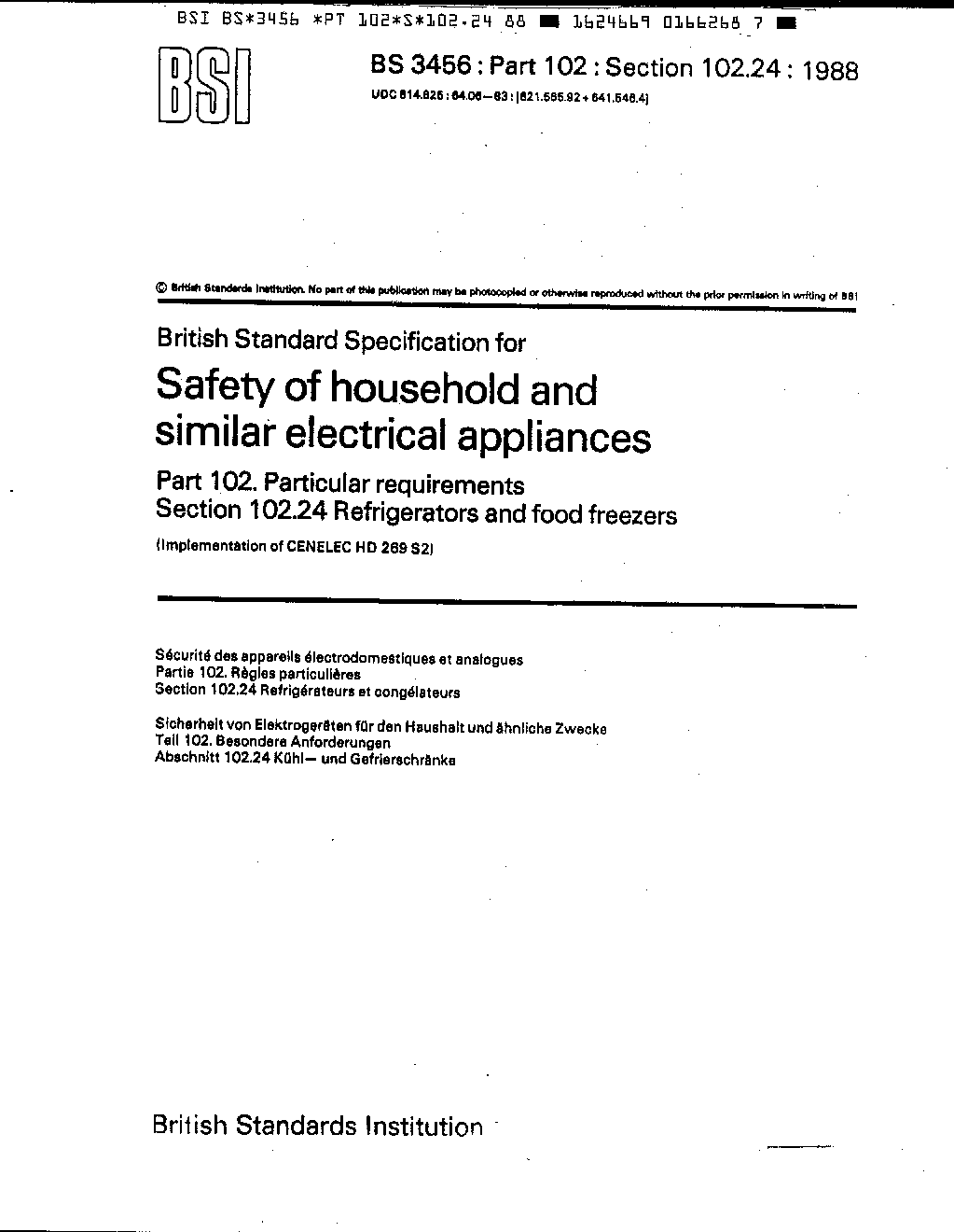 Specification for safety of household and similar electrical appliances. Particular requirements Refrigerators food freezers