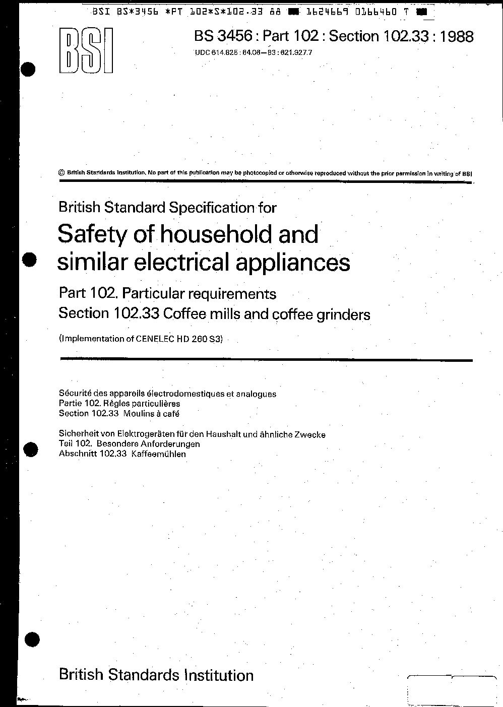 Specification for safety of household and similar electrical appliances. Particular requirements Coffee mills coffee grinders