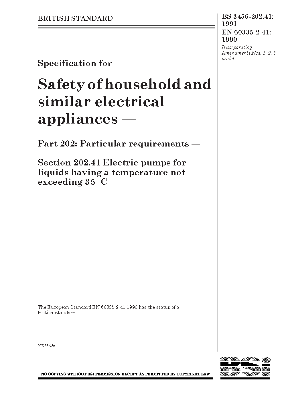 Specification for safety of household and similar electrical appliances. Particular requirements Electric pumps liquids having a temperature not exceeding 35°C