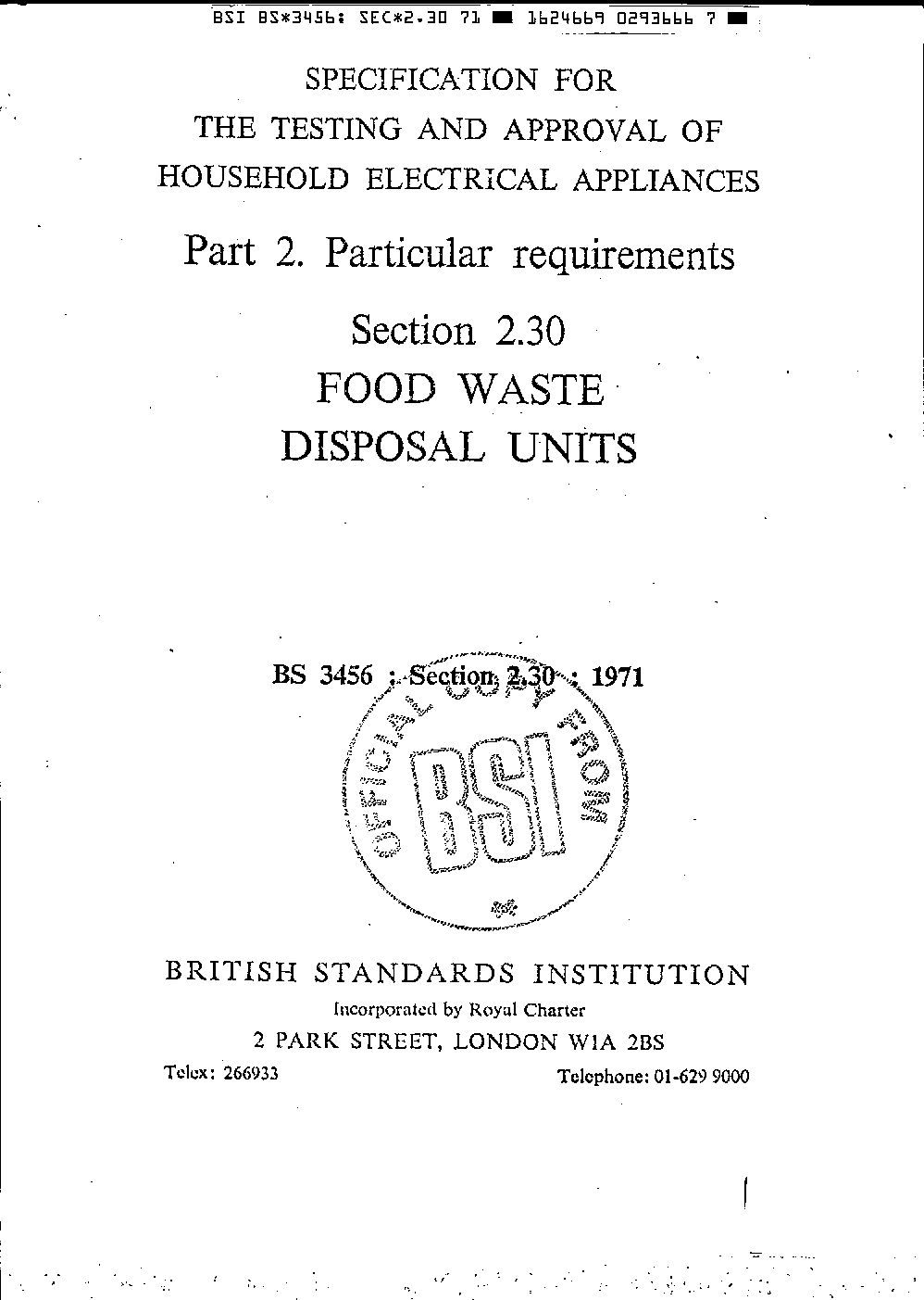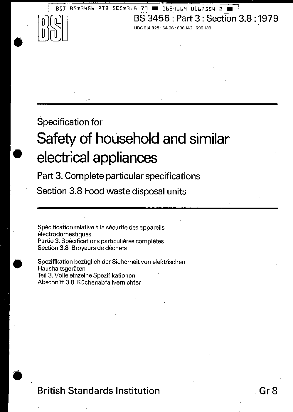 Specification for safety of household and similar electrical appliances. Complete particular specifications Food waste disposal units