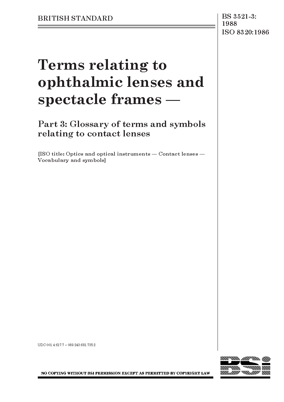 Glossary of terms relating to ophthalmic lenses and spectacle frames contact