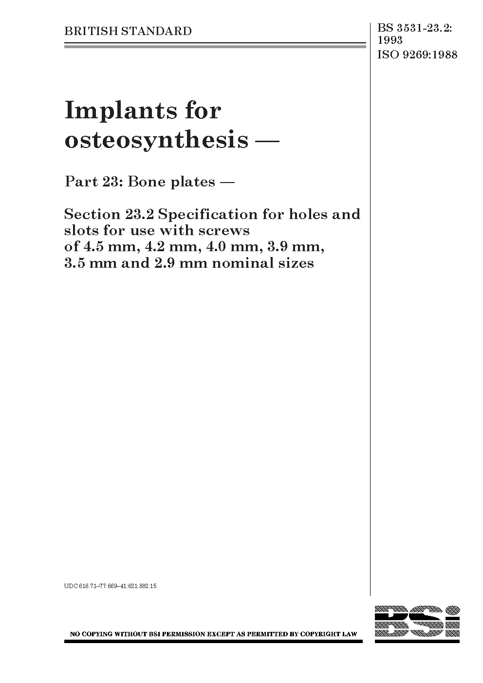 Implants for osteosynthesis. Bone plates Specification holes and slots use with screws of 4,5 mm, 4,2 4,0 3,9 3,5 mm 2,9 nominal sizes