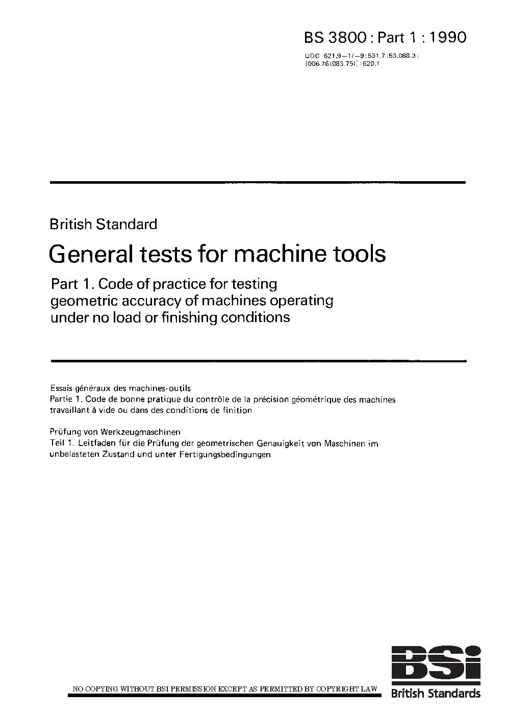 General tests for machine tools Code of practice testing geometric accuracy machines operating under no load or finishing conditions