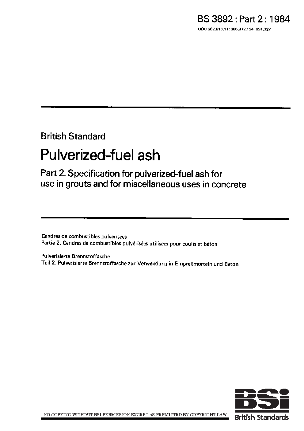 Pulverized-fuel ash Specification for pulverized-fuel use in grouts and miscellaneous uses concrete