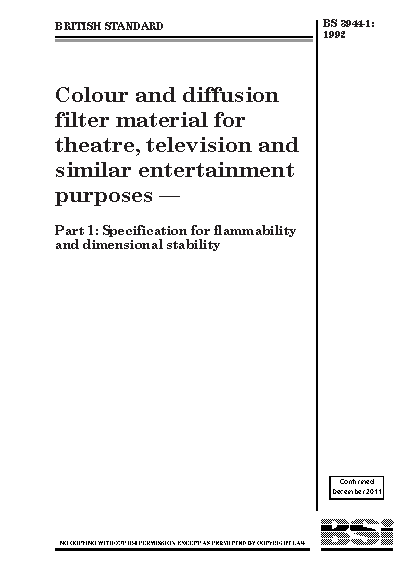 Colour and diffusion filter material for theatre, television similar entertainment purposes. Specification flammability dimensional stability