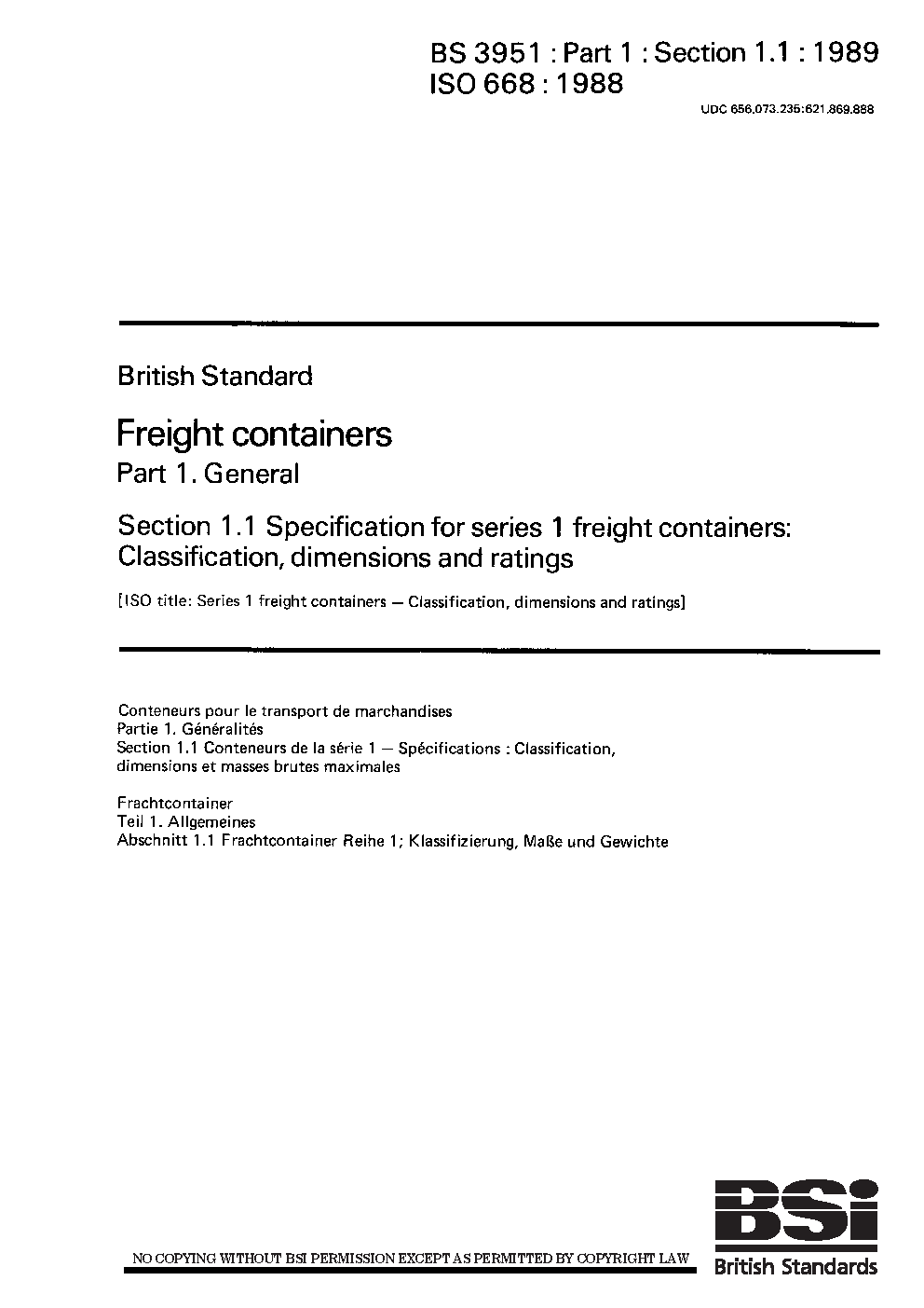 Freight containers. General Specification for Series 1 freight containers: Classification, dimensions and ratings