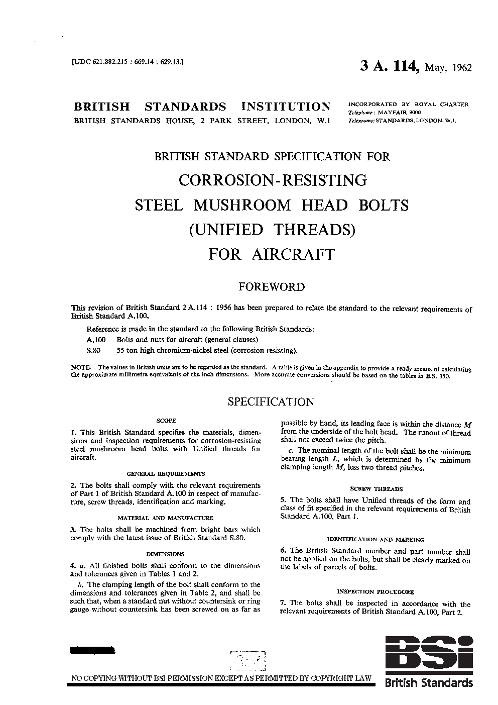 Specification for corrosion-resisting steel mushroom head bolts (Unified threads) for aircraft