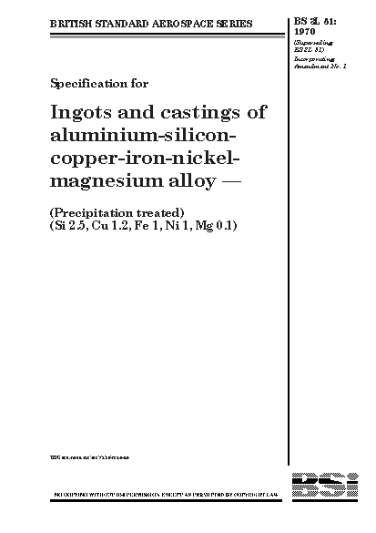 Specification for ingots and castings of aluminium-silicon-copper-iron-nickel-magnesium alloy (precipitation treated) (Si 2.5, Cu 1.2, Fe 1, Ni 1, Mg 0.1)