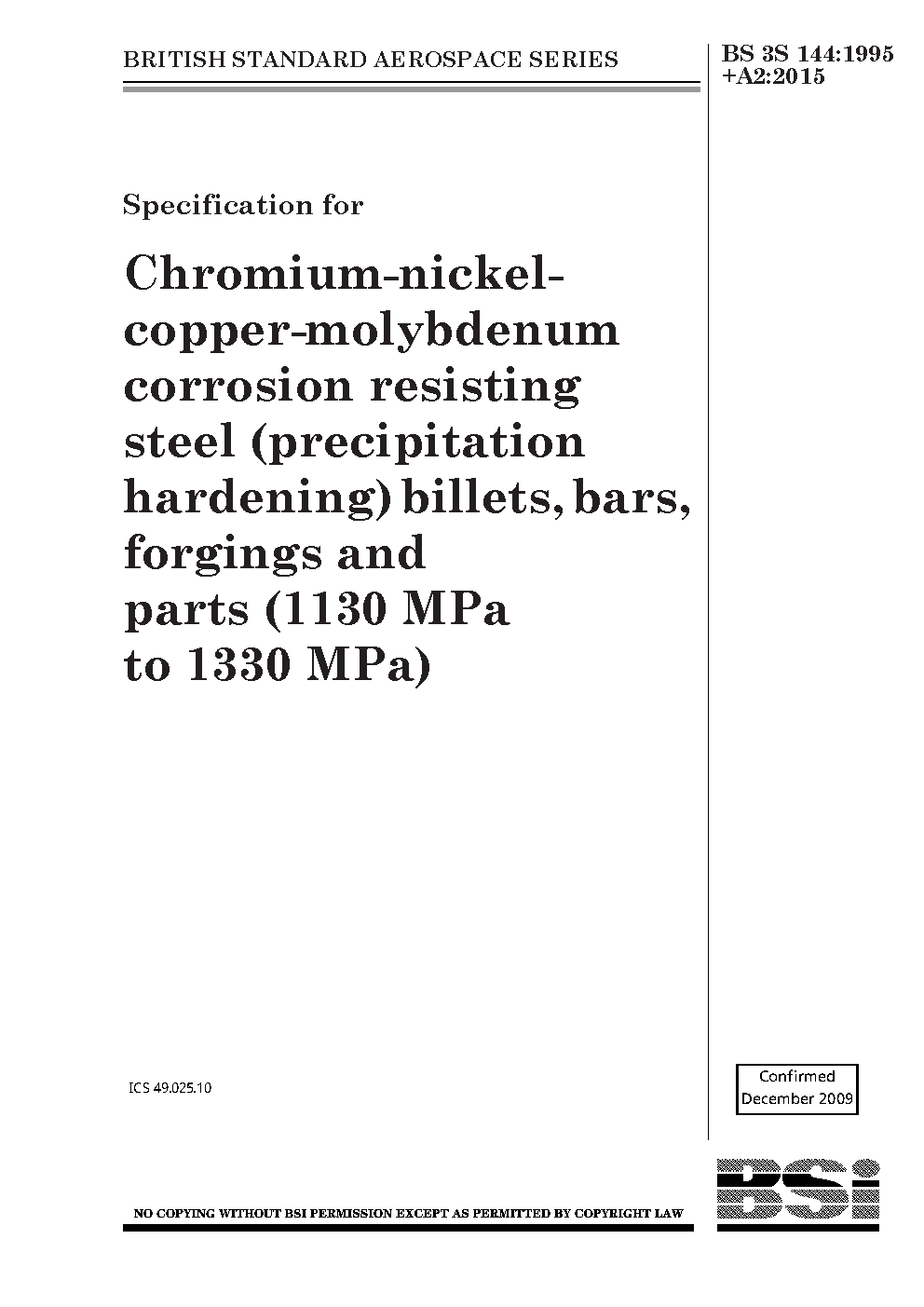 Specification for chromium-nickel-copper-molybdenum corrosion resisting steel (precipitation hardening) billets, bars, forgings and parts (1130-1330 MPa)