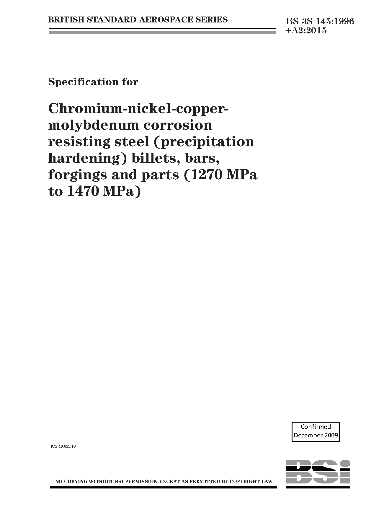 Specification for Chromium-nickel-copper-molybdenum corrosion resisting steel (precipitation hardening) billets, bars, forgings and parts (1270 MPa to 1470 MPa)