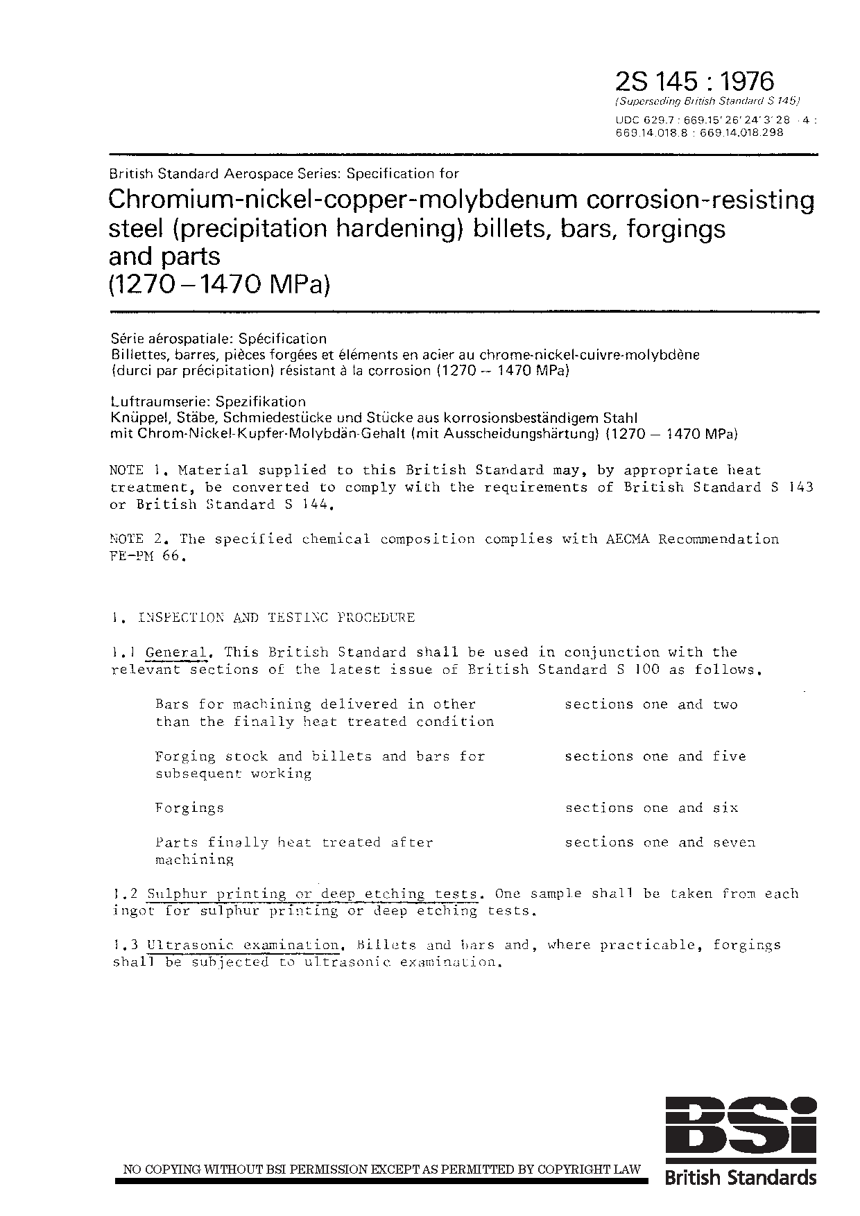 Bars (materials);Chromium steels;Alloy steels;Forgings;Molybdenum steels;Chemical composition;Nickel steels;Billets;Corrosion-resistant steels;Elongation;Stainless steels;Air transport engineering;Tensile strength;Steels;Copper steels;Impact strength;Hardness;Proof stress;Heat treatment;Forging stock