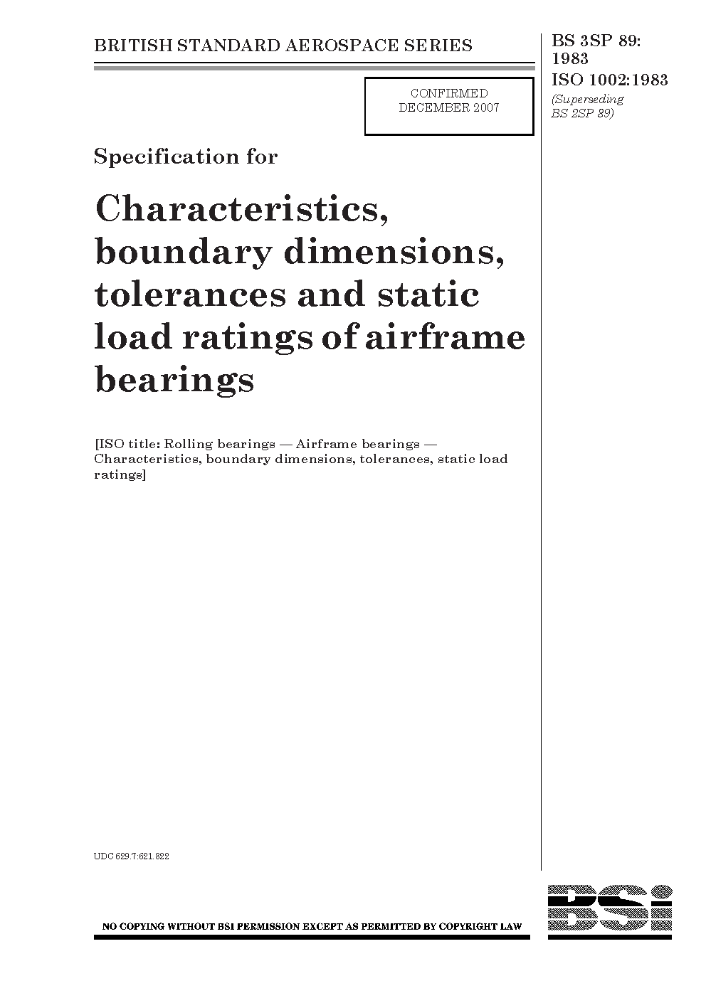 Specification for characteristics, boundary dimensions, tolerances and static load ratings of airframe bearings