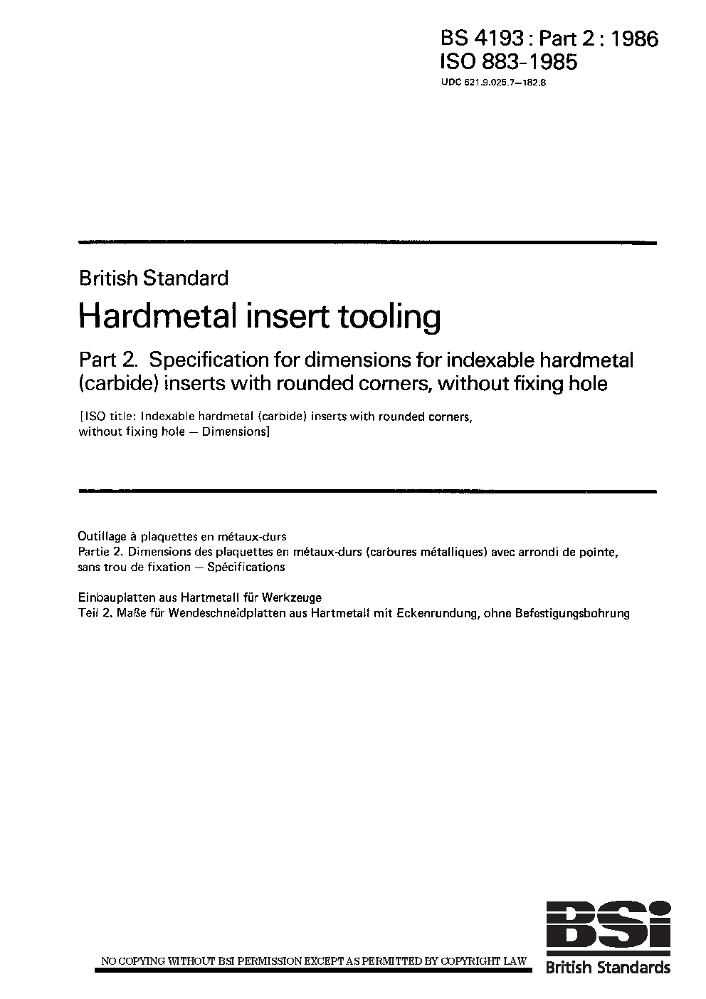 Hardmetal insert tooling Specification for dimensions indexable (throwaway) hardmetal inserts without fixing hole