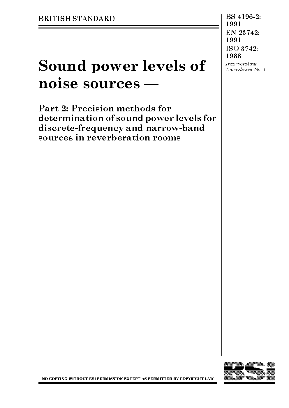 Sound power levels of noise sources Precision methods for determination sound discrete-frequency and narrow-band in reverberation rooms